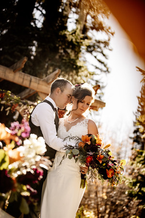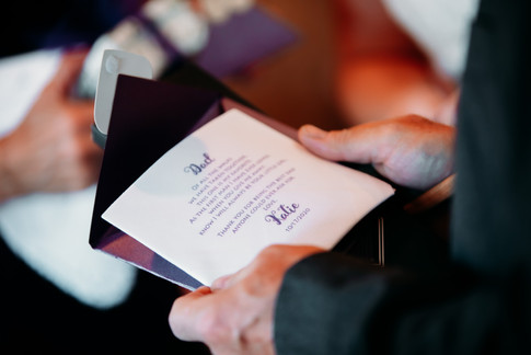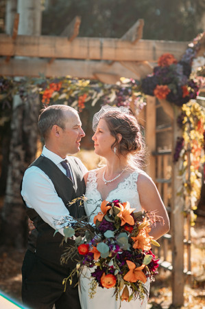 Their ceremony was socially distanced, they had a seating chart and all the chairs of different pods were placed a good distance from each other. So everyone could sit and safely enjoy their ceremony. The ceremony was absolutely beautiful, with a fall forest backdrop and light streaming through the trees! The colors Katie and Clay picked went beautifully with their surroundings, complementing the natural colors around them with pops of purple. Their flowers by Lulu's Petals looked like beautiful waterfalls of color.